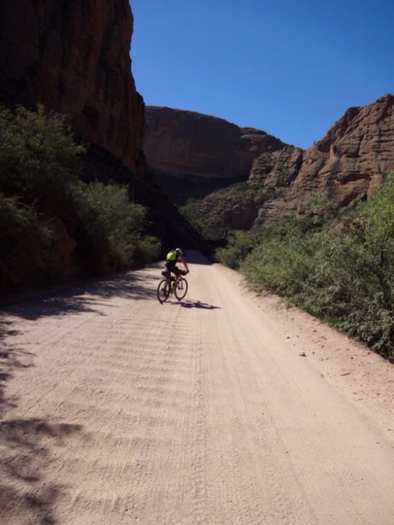 Es werden weitere Umfahrungen folgen, aber dieses ist die Längste. Im Vorfeld hatte ich mich über eine andere Option zur Umfahrung, mitten durch das Buschland der Superstition Mountains schlau gemacht, diese jedoch wegen der langen Schiebepassagen wieder verworfen. So blieb nur der Weg von Payson über die Teerstrasse, gefolgt vom Apache Trail, bei dem es sich nicht um einen Trail handelt, sondern um eine ungeteerte Strasse und zu guterletzt wiederum über ein Teilstück auf dem vielbefahrenen Highway nach Superior. Ihr könnt euch vorstellen dass unser Trailherz bei dieser Aussicht nicht gerade grosse Sprünge machte. Aber was getan werden muss, muss halt eben getan werden. Als dann Kim, die Rezepionistin unseres Hotels das Gefühl hatte, auf dem Highway 87 raus aus Payson sei es viel zu gefährlich für uns und deshalb vorschlug, dass der Hotelshuttle uns doch ein paar Meilen bis zur Wegkreuzung transportieren könnte, sagten wir nicht nein und waren froh, um diese Erleichterung. Der Shuttlefahrer wollte dann natürlich Bares sehen, aber das war uns auch recht. So kam es also, dass unsere heutige Etappe frühmorgens im Shuttlebus startete. Vom Teerstrasse raspeln will ich hier nicht berichten. Interessant war aber besagter Apache Trail. Dieser führt auf Sandpiste vom Roosevelt Reservoir an schönen Stauseen vorbei in Richtung Phoenix. Die Seen wirken dabei wie Fata Morganas im staubtrockenen und mit mannshohen Kakteen versehenen Umland. Die Strasse windet sich pausenlos durch Schluchten hoch nur um anschliessend gleich wieder abzufallen. So geht das stundenlang. Die Aussicht war aber immer toll und einige Pickupfahrer schafften es sogar zu überholen ohne dass wir danach Sand zwischen den Zähnen hatten. Leider eben nur einige, darum musste zur Halbzeit und gleichzeitigem Ende der ungeteerten Piste ein Bad im Stausee her! Das Wasser war herrlich und kühlend, denn mittlerweile betrug die Aussentemperatur 37 Grad. Kein Kunststück, denn wir befanden uns nunmehr auf 500 Metern über Meer. Seit dem Grand Canyon hatten wir fast 2000 Höhenmeter verloren. Nach dem Mittagsrast ging es erst noch hübsch weiter nun eben der Teerstrasse folgend und vorbei an Goldgräberstädtchen mit Saloons und Goldminen bis wir Apache Junction erreichten. Der Rest der Etappe ist schnell erzählt. Es wurde immer heisser und die stetig steigende Teerstrasse zum Etappenziel in Superior kochte uns wie ein Backofen. Einmal hielt ich direkt auf ein Mc Donalds Schild zu nur um zu merken, dass da gar kein Lokal war sondern eben nur dieses Schild, welches regungslos die Meldung verbreitete, dass besagter Mc Donalds in 30 Meilen käme. An dieser Stelle nicht lachen bitte…es war wirklich hart! Diese Etappe brauchte Körner und die galt es wieder aufzufüllen. Darum sind wir seit der Ankunft eigentlich nur noch am Essen. Morgen gehts wieder auf dem Arizona Trail weiter. Ä Guete wünscht Mat