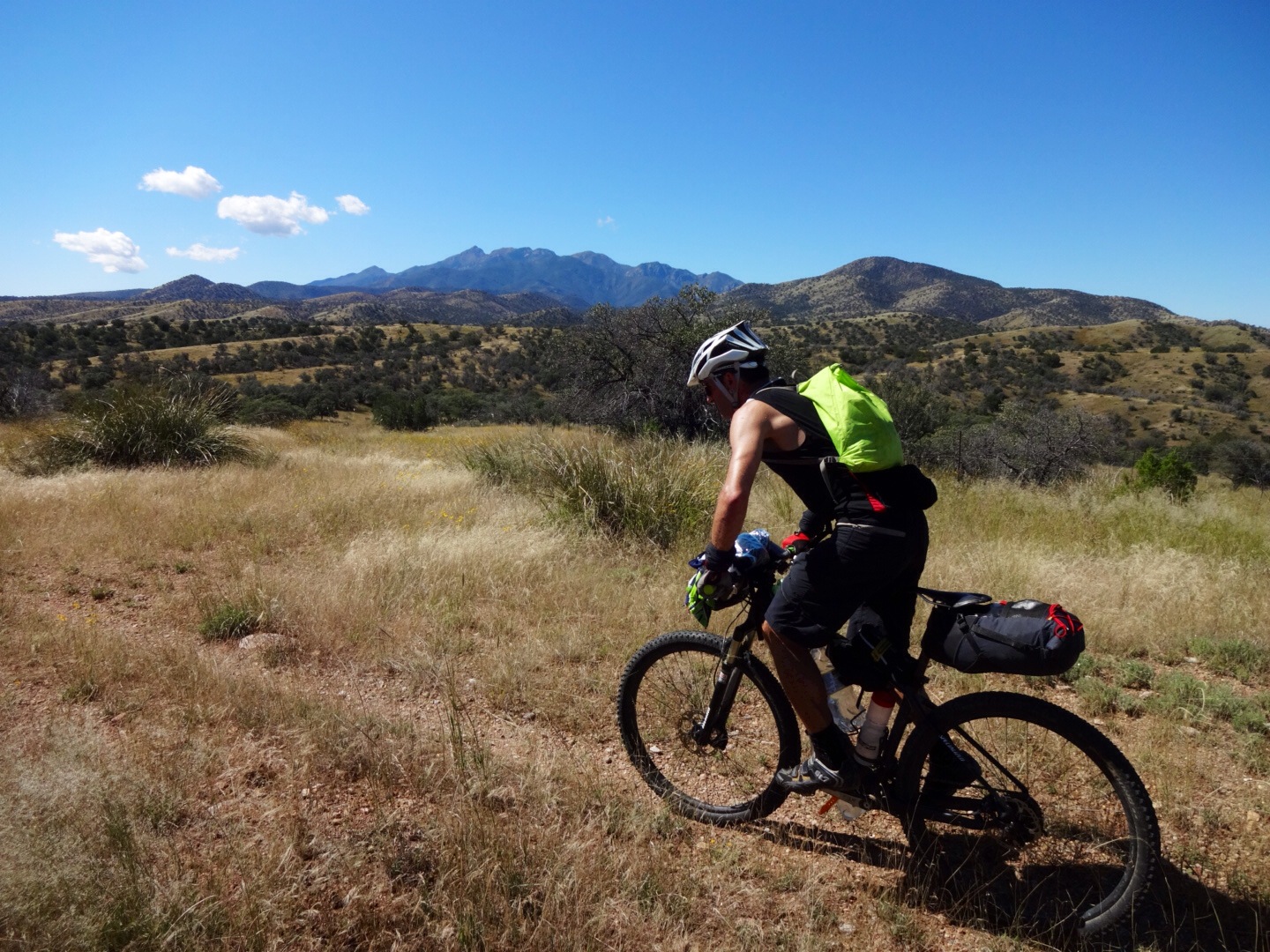 Schon bald allerdings mussten wir feststellen, dass der Untergrund steiniger, das Gras höher und die Anstiege steiler und ziemlich technisch wurden. Spaßiges Terrain, aber mit unseren 20kg-Brummern (6l Wasser an Bord) konnten wir natürlich nicht wirklich Strecke machen.
