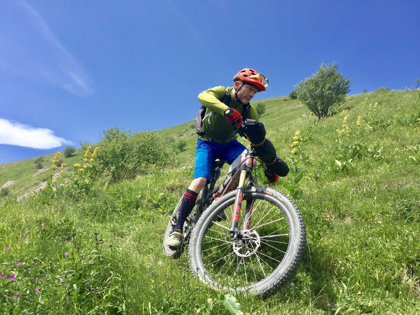 Anyway, wir wollten sowieso nicht zu viel Zeit verlieren, da die schwüle Hitze Gewitter versprach. Wir entschieden uns deshalb auch für den kürzeren der zwei Passübergänge, den Col d‘ Hurtières. Dieser bot alles, was das Bikepackerherz begehrt: baden im eigenen Schweiß, Stechviecher, Umleitungen, steile und rutschige Schiebepassagen, Fehlnavigationen oder kratzig-beißende Alpenwiesen.