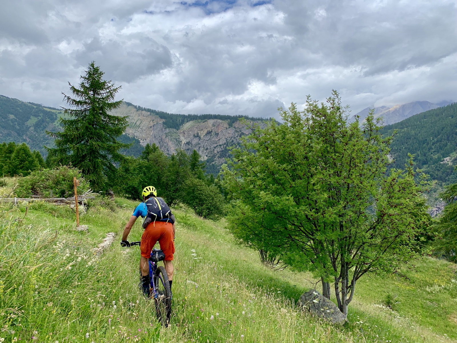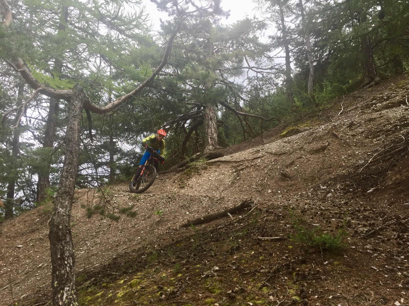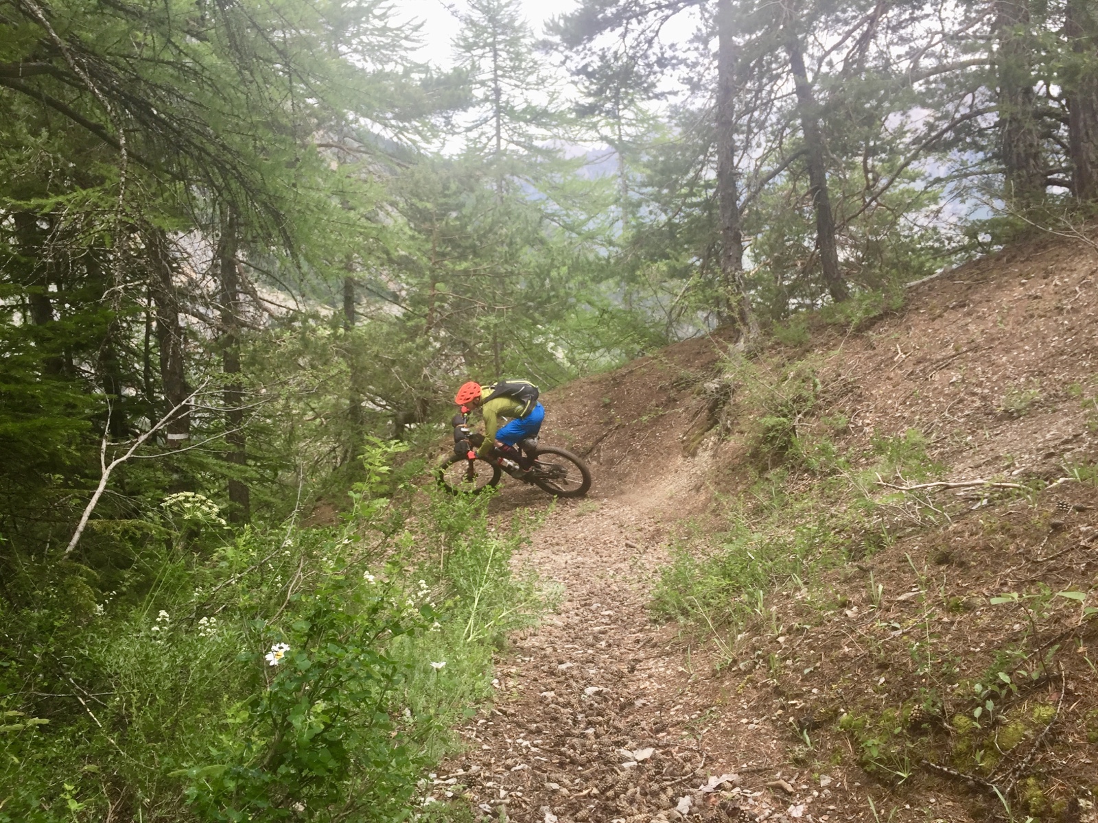 Auf dem Col des Lauzes angekommen, folgte eine steile, manchmal etwas zugewachsene Abfahrt, welche volle Konzentration forderte, waren doch die Wurzeln und Steine noch nass vom vorangegangenen Regen.