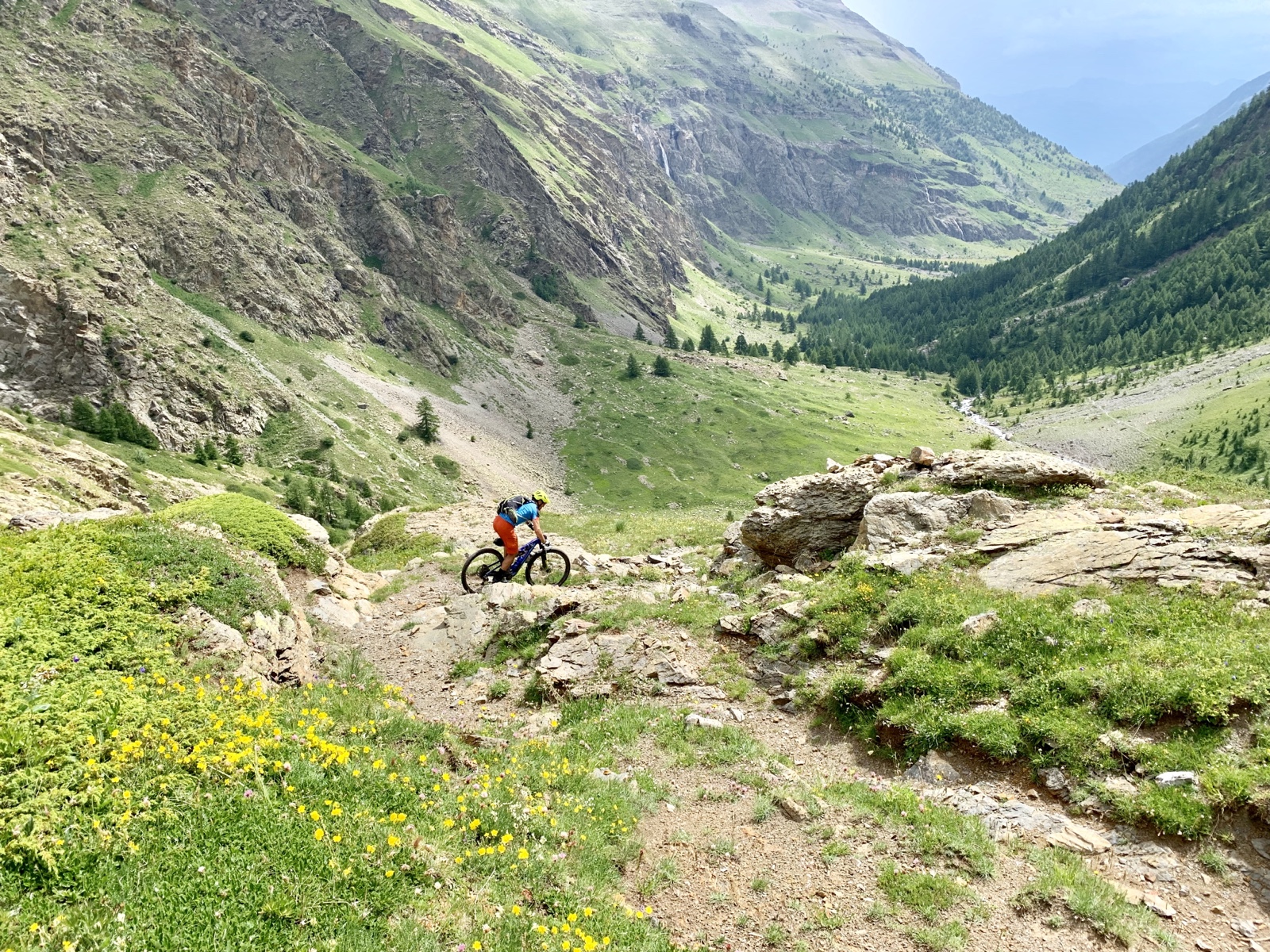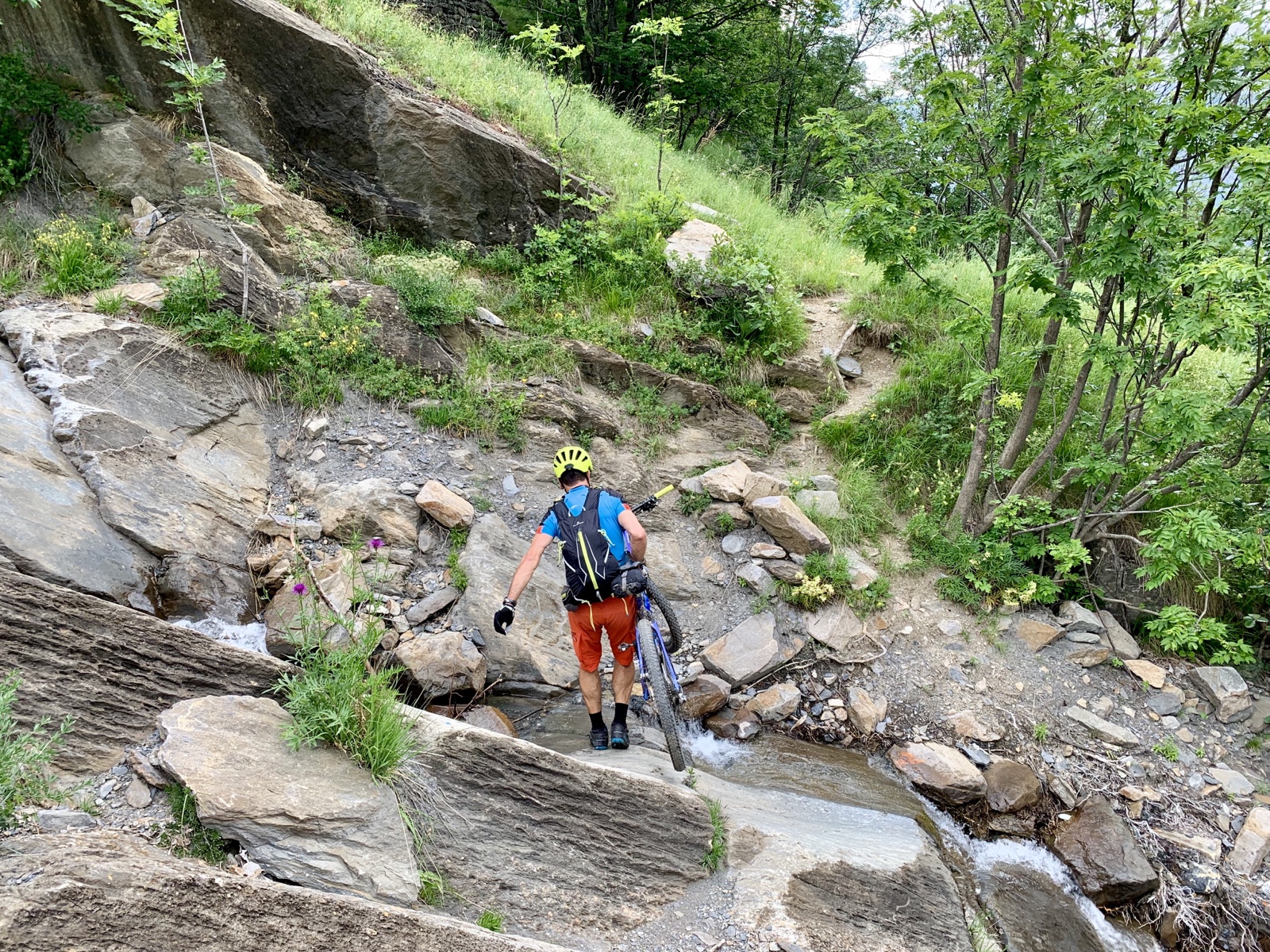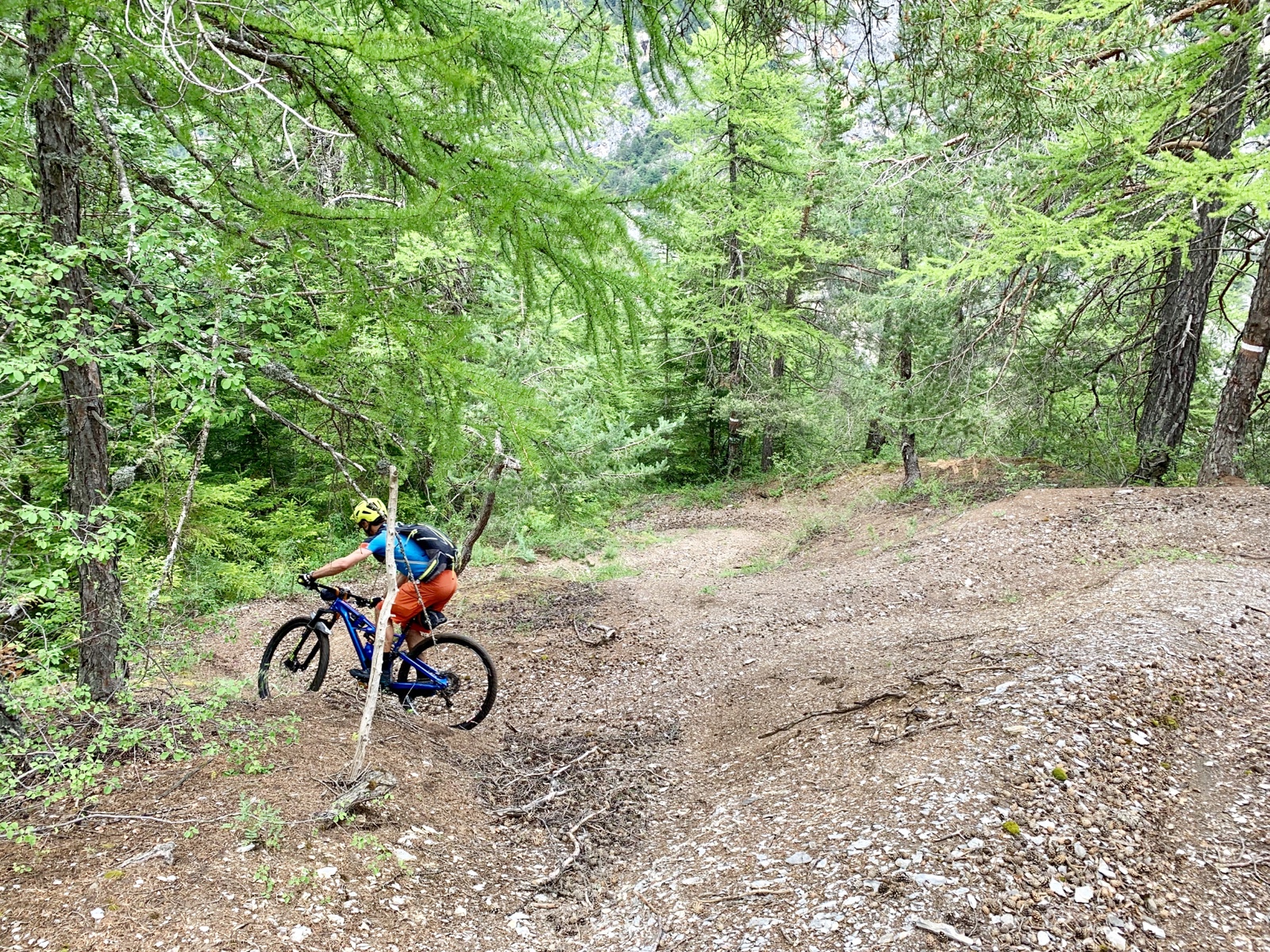 Auf dem Col des Lauzes angekommen, folgte eine steile, manchmal etwas zugewachsene Abfahrt, welche volle Konzentration forderte, waren doch die Wurzeln und Steine noch nass vom vorangegangenen Regen.
