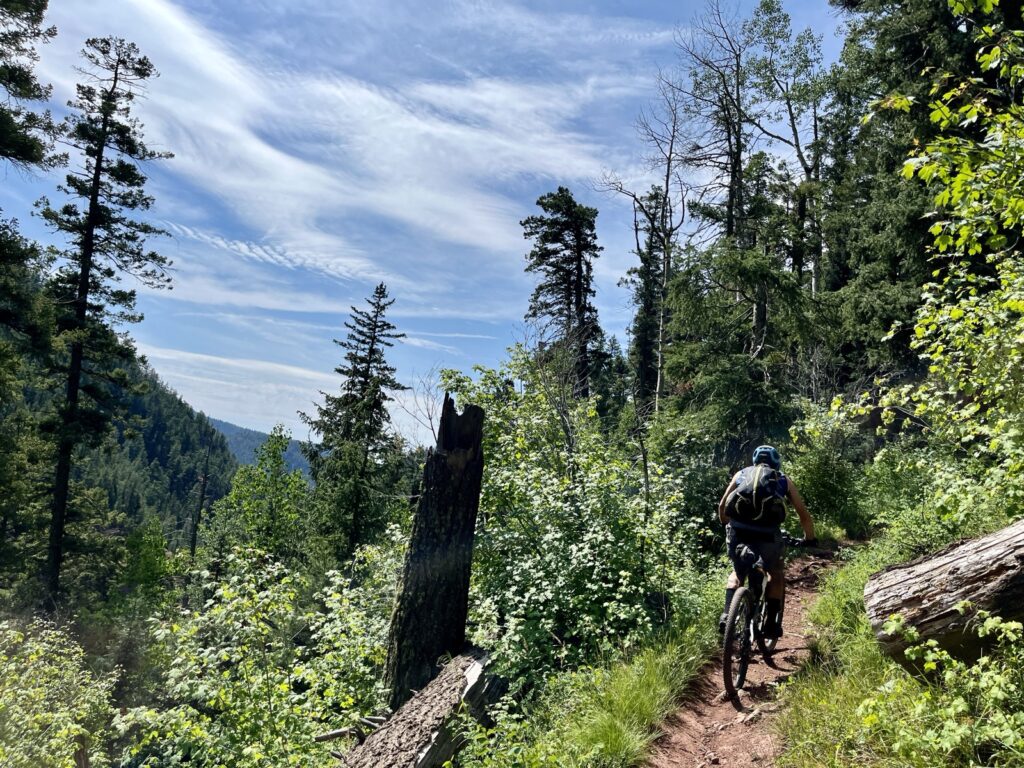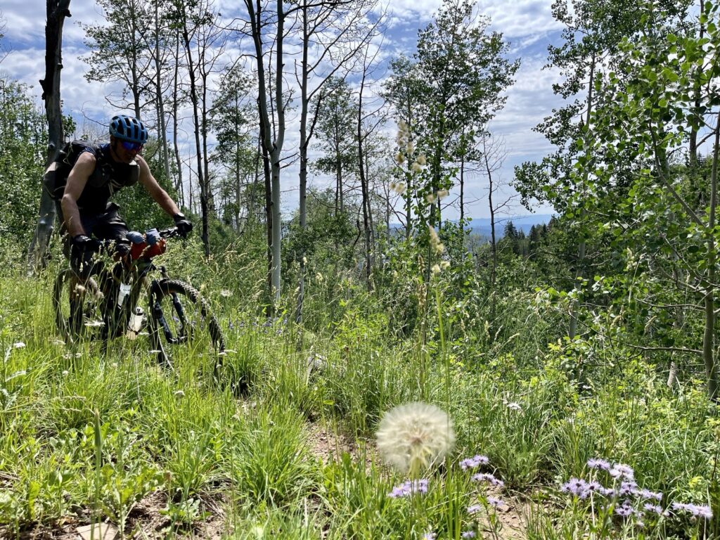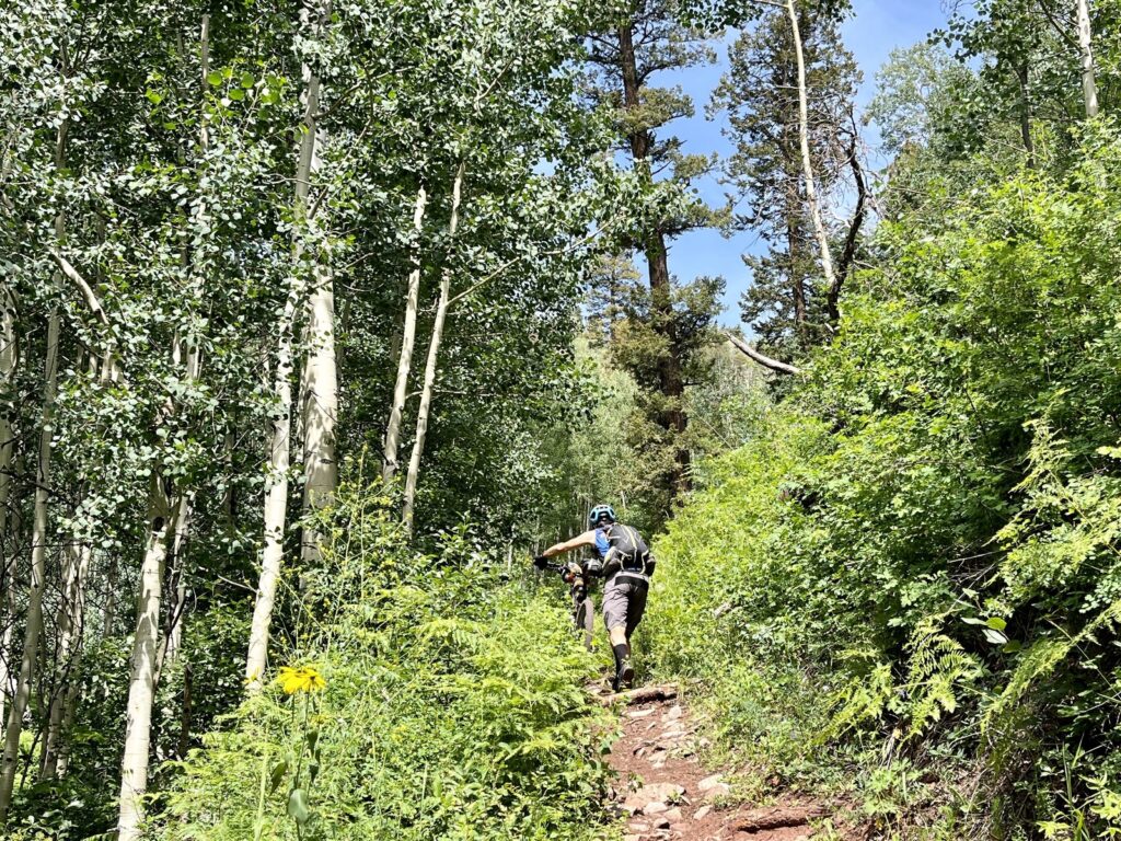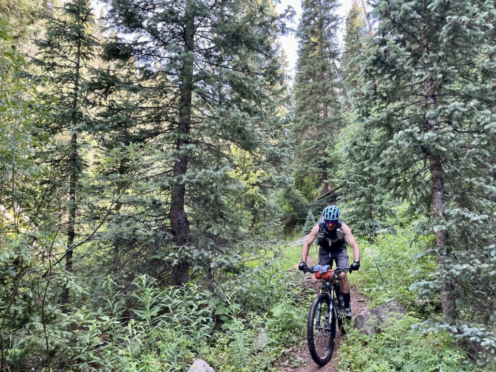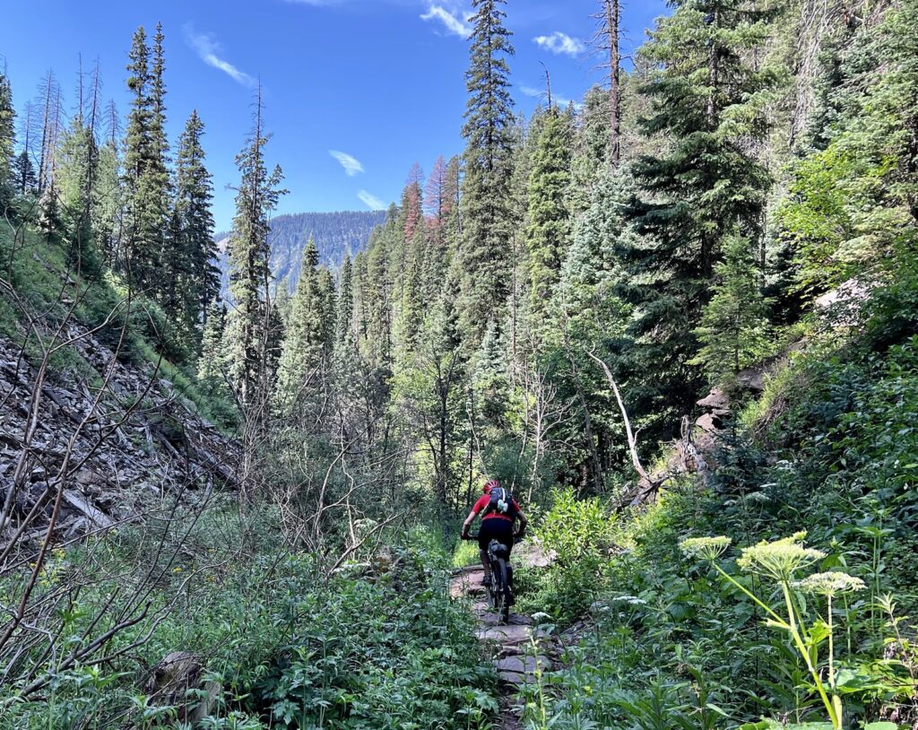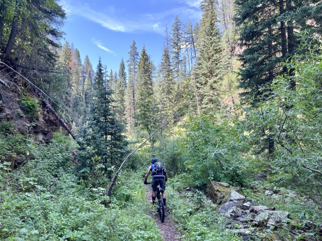 Wir folgten weiter dem spassigen Trail hinunter in eine Schlucht. Zum Glück hatten wir gutes digitales Kartenmaterial und wussten, dass uns noch ein happiger Aufstieg bevorstand. Doch vorerst ging es kilometerlang durch dichtes, feuchtes und mannshohes Grünzeugs dem Bach entlang bergab. Für solche Dschungel-Bedingungen ist Colorado wahrlich nicht bekannt!