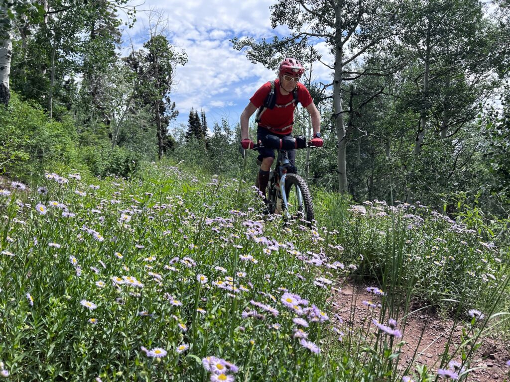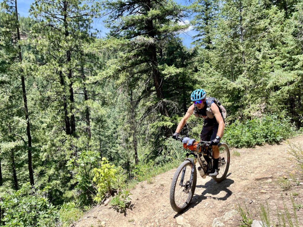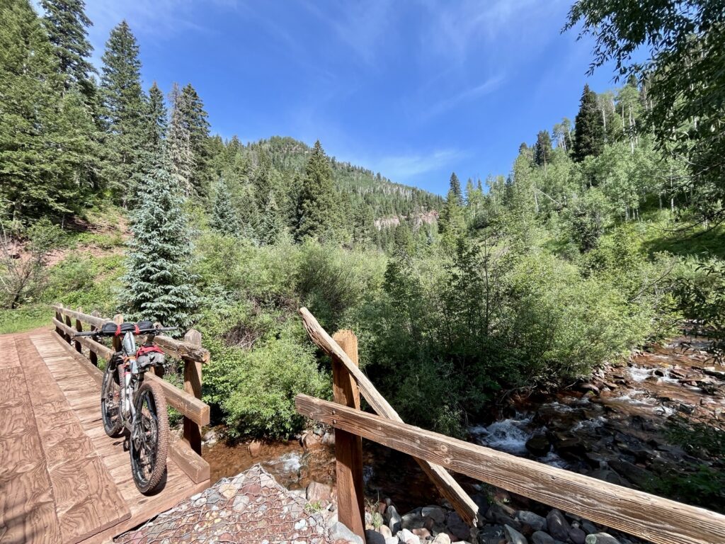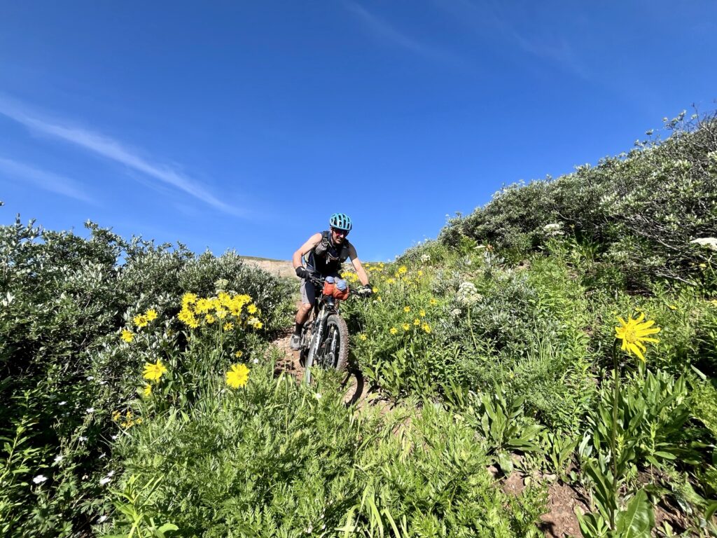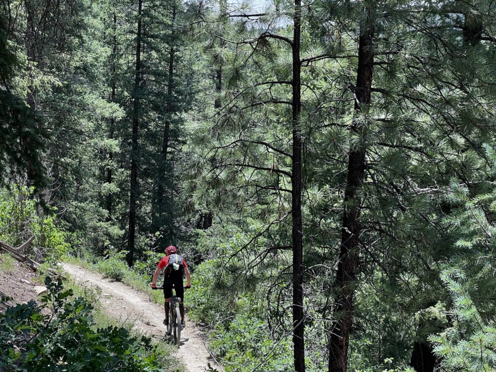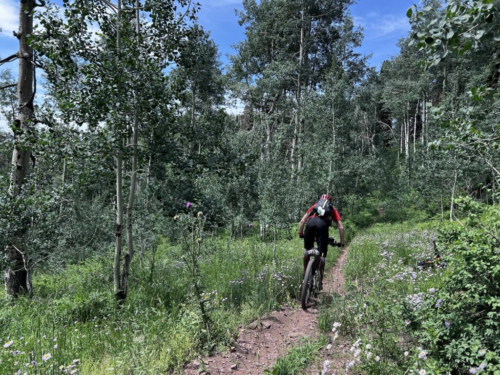 Wir folgten weiter dem spassigen Trail hinunter in eine Schlucht. Zum Glück hatten wir gutes digitales Kartenmaterial und wussten, dass uns noch ein happiger Aufstieg bevorstand. Doch vorerst ging es kilometerlang durch dichtes, feuchtes und mannshohes Grünzeugs dem Bach entlang bergab. Für solche Dschungel-Bedingungen ist Colorado wahrlich nicht bekannt!