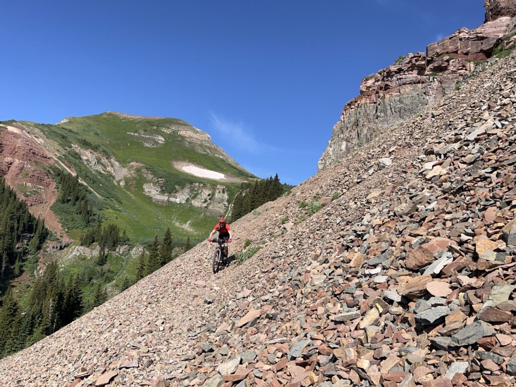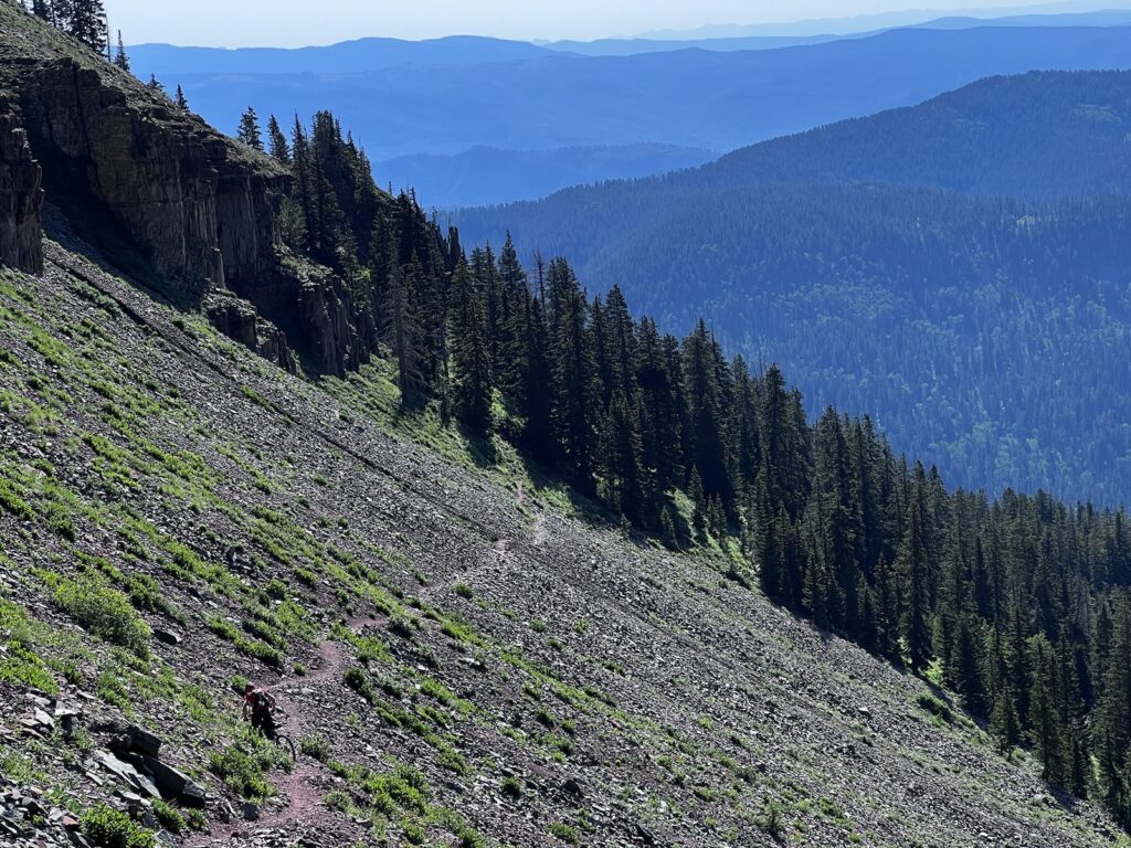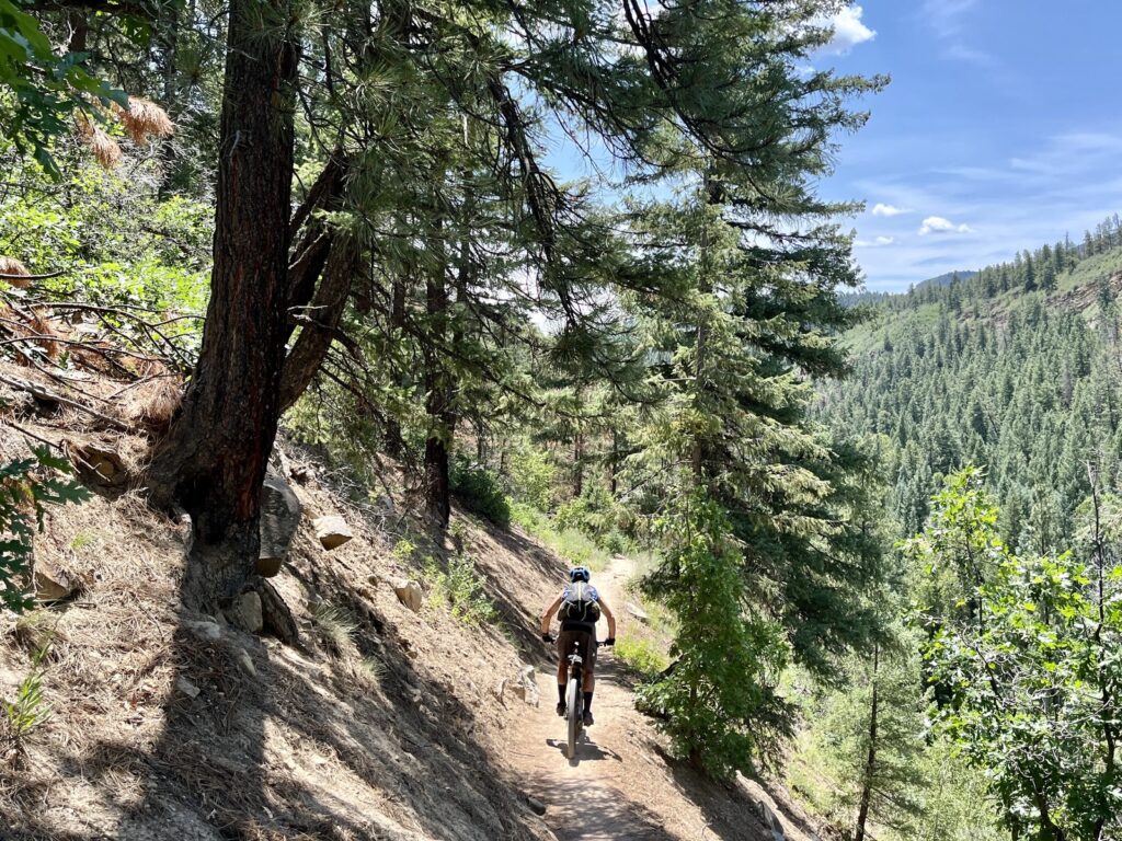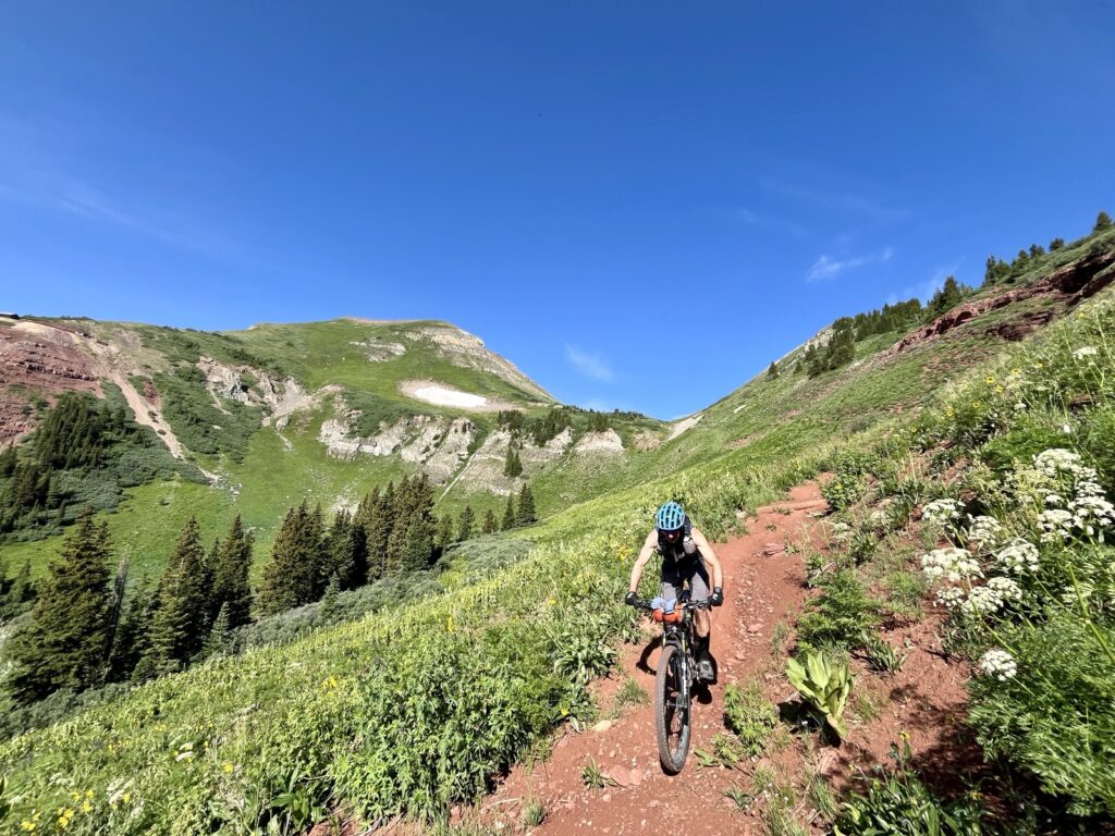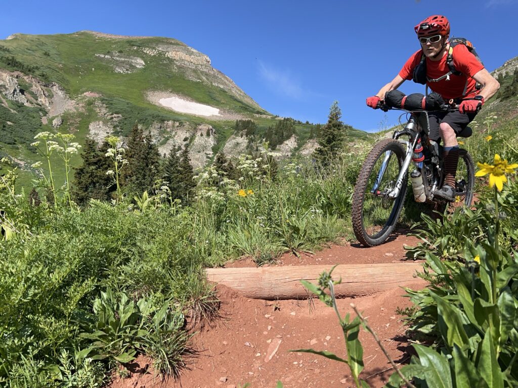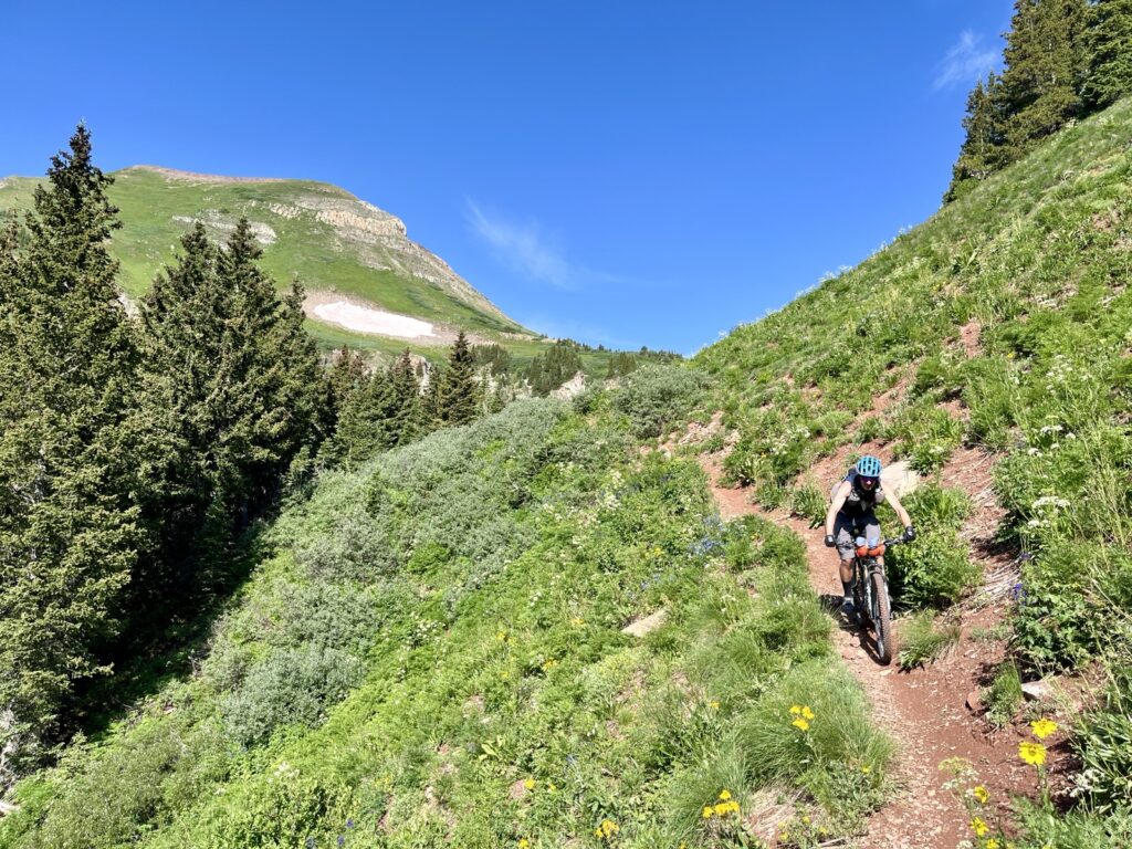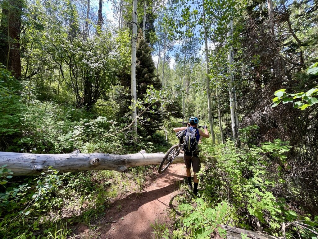 Wir folgten weiter dem spassigen Trail hinunter in eine Schlucht. Zum Glück hatten wir gutes digitales Kartenmaterial und wussten, dass uns noch ein happiger Aufstieg bevorstand. Doch vorerst ging es kilometerlang durch dichtes, feuchtes und mannshohes Grünzeugs dem Bach entlang bergab. Für solche Dschungel-Bedingungen ist Colorado wahrlich nicht bekannt!