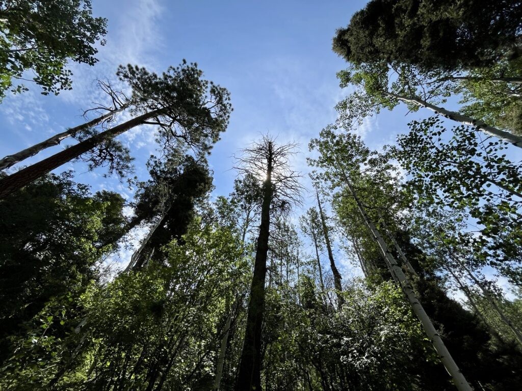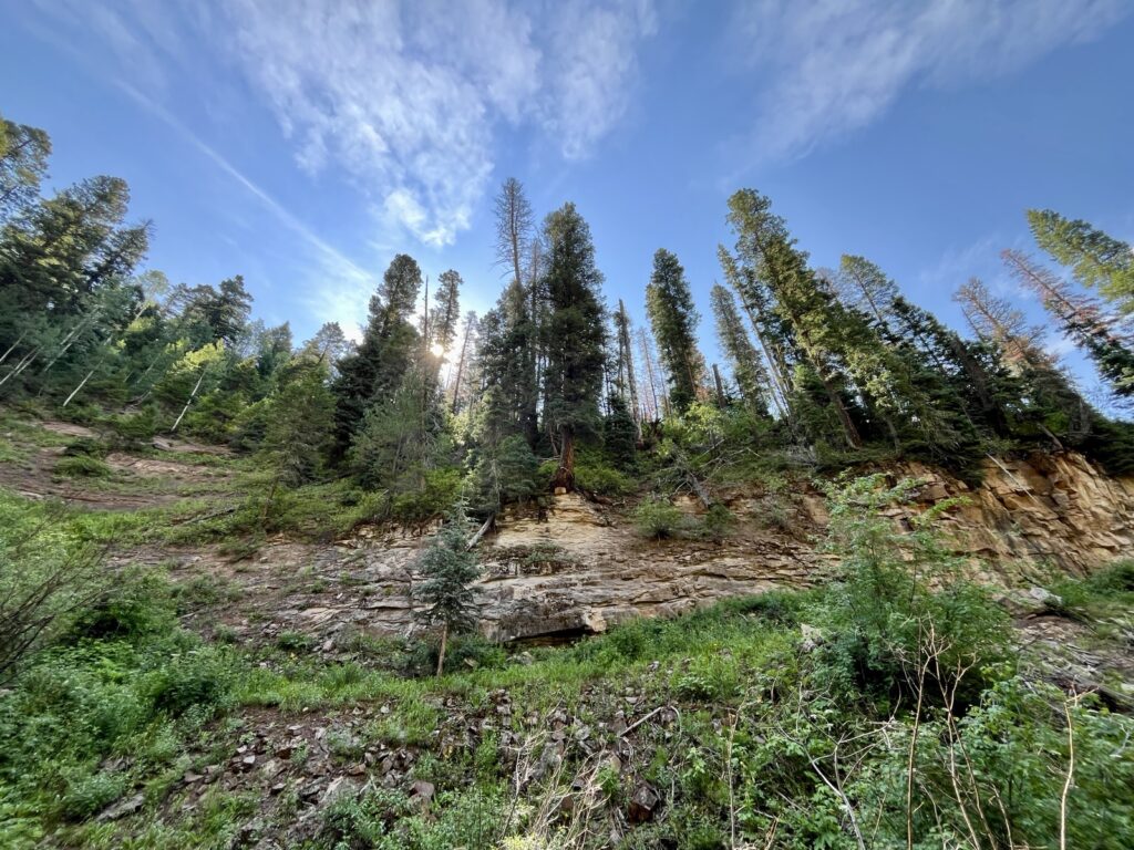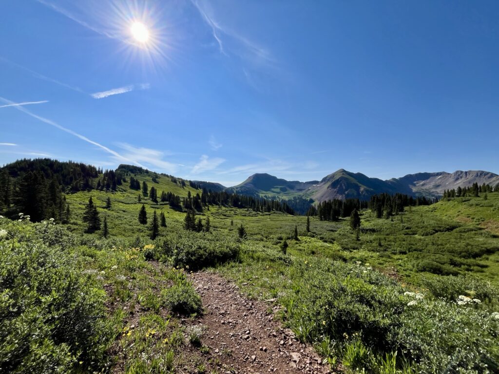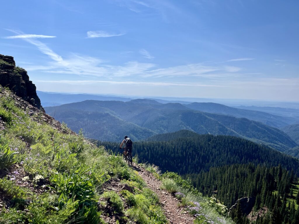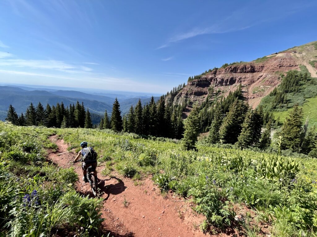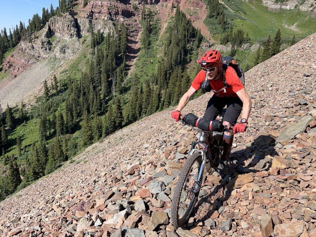 Wir folgten weiter dem spassigen Trail hinunter in eine Schlucht. Zum Glück hatten wir gutes digitales Kartenmaterial und wussten, dass uns noch ein happiger Aufstieg bevorstand. Doch vorerst ging es kilometerlang durch dichtes, feuchtes und mannshohes Grünzeugs dem Bach entlang bergab. Für solche Dschungel-Bedingungen ist Colorado wahrlich nicht bekannt!