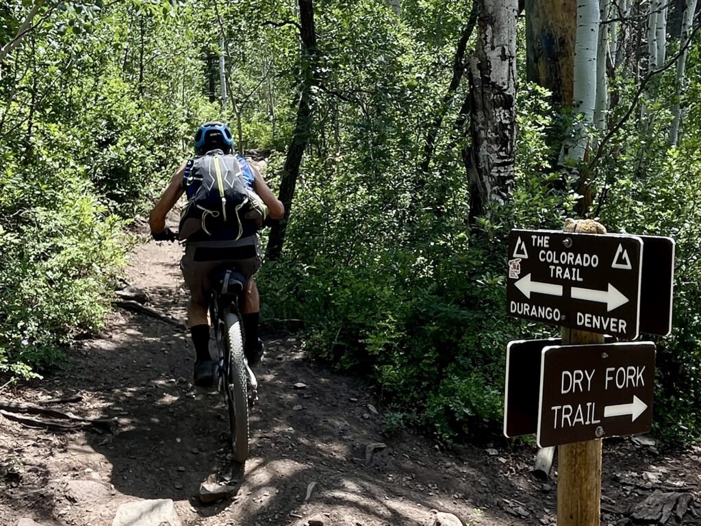 Am untersten Punkt, bei der Brücke über den Junction Creek, füllten wir nochmals unsere Bidons und trafen einen jungen CT-Hiker, der in der Gegenrichtung unterwegs und auf seiner zweiten Etappe war. Wir wünschten ihm viel Glück- was er mit seinem riesigen Rucksack und seiner bescheidenen Erfahrung bestimmt gut gebrauchen konnte – und fuhren weiter.