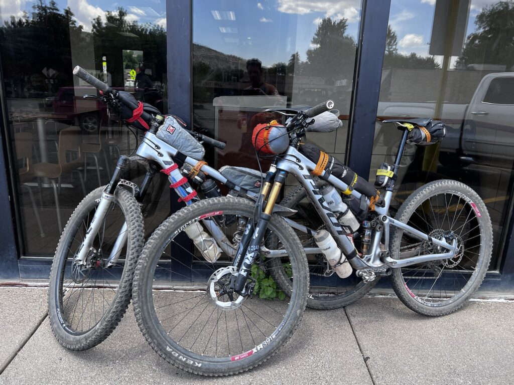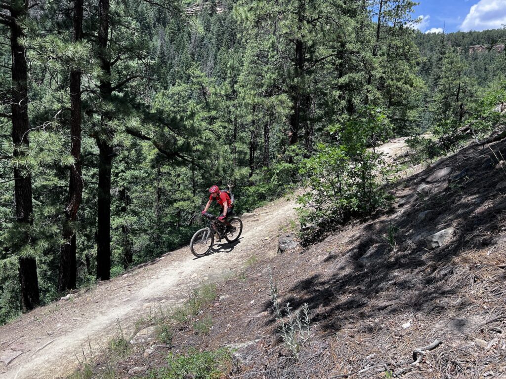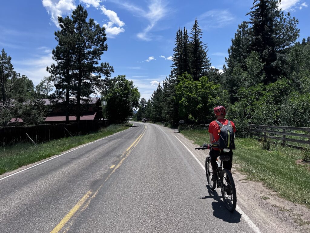 Die Landschaft wechselte nun, und wir rasten zuerst flüssig und rasant durch lichte Espenwälder, später wurden Boden, Geruch, Vegetation und vor allem die Temperaturen mediterran. 32 Grad Celsius waren für heute in unserem Zielort Durango – auf 2000 müM gelegen (!) – angesagt. Wir schwitzten und zirkelten unsere beladenen Carbonrössli über felsige Stufen, Anliegerkurven und andere Prüfsteine für Mensch und Maschine.