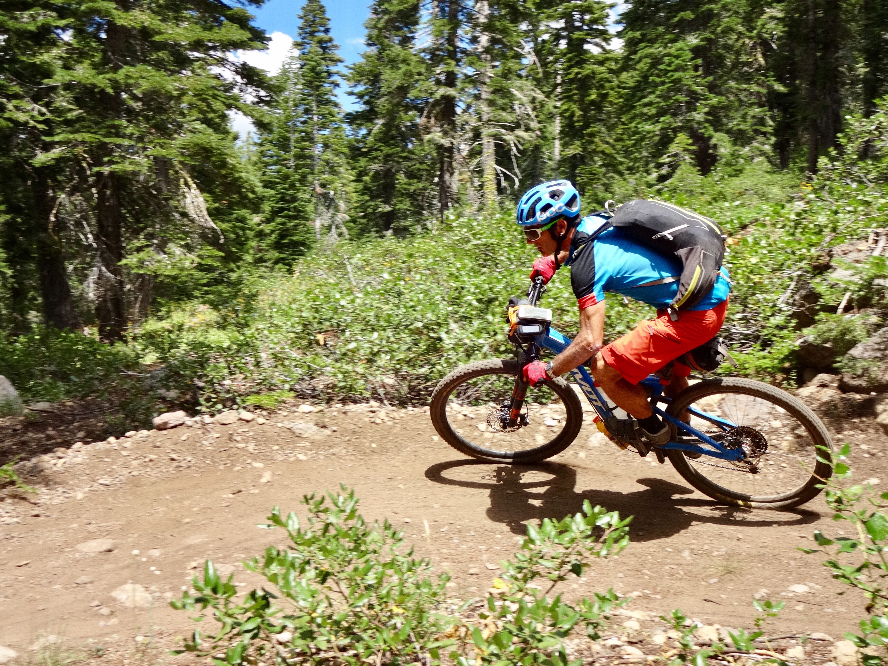 Auf einem typischen Tahoe-Trail ging’s flüssig über Dutzende Kurven und kleine Sprünge Richtung Tal, wobei wir zu unser Verwunderung etwa 10 Biker kreuzten, die den gleichen Trail bergauf fuhren. Bisher hatten wir Biker nur entweder bergab oder im Pickup fahren gesehen.
