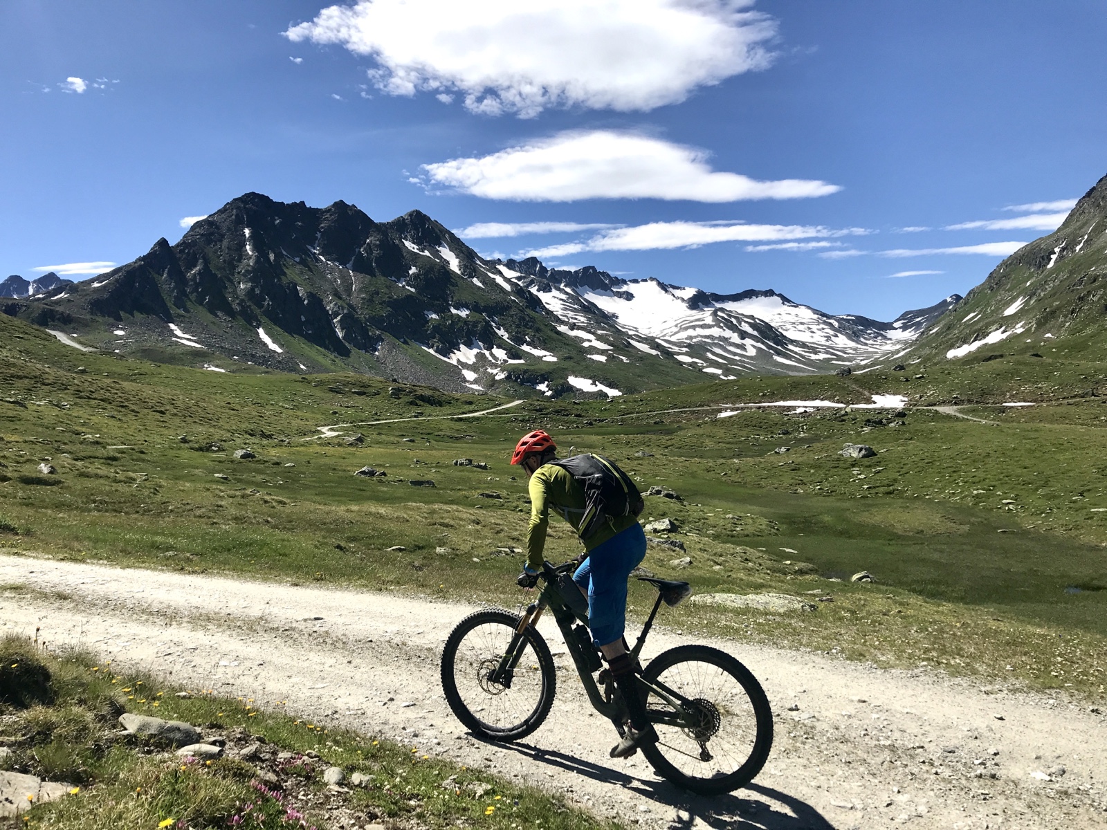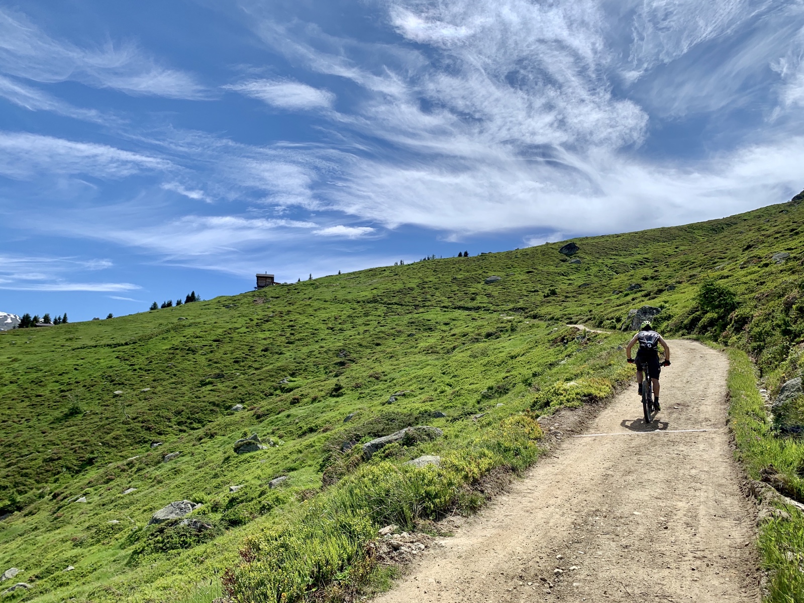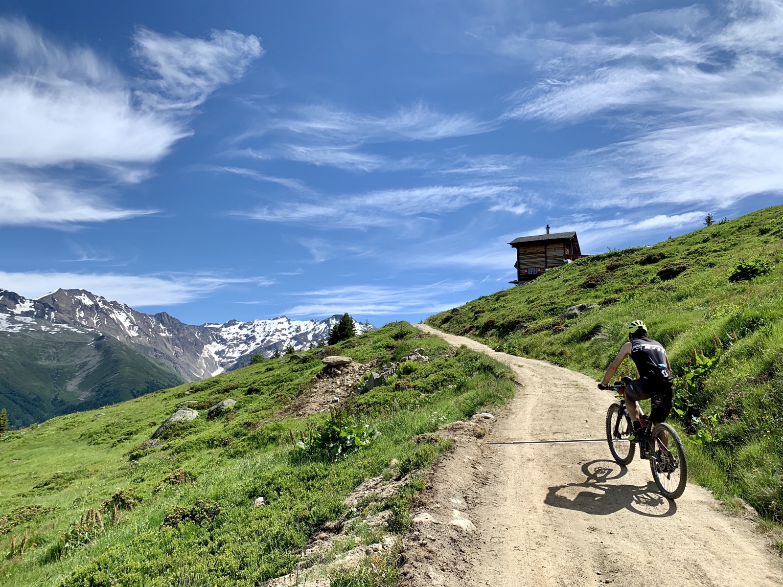 Nun, die 900 Höhenmeter zur Galmihornhütte absolvierten wir in zügigem Tempo. Einzig kurz ausgebremst vom Hüttenwart, welcher uns in seinem Subaru entgegen kam und unmissverständlich klar machte, dass er Vortritt habe und Biker absteigen und ins abschüssige Gelände fliehen müssten, wenn sie seinen Weg kreuzen würden.