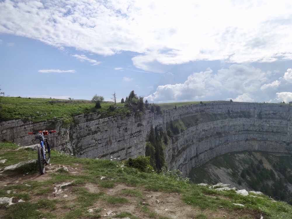 Ich kaufte auch gleich ein paar Sachen für ein mögliches Nachtessen draussen ein, denn von Gewittern war heute nichts zu sehen. Danach folgte der nächste Aufstieg zum Creux du Van. Dieser war zwar streng, aber der Weg war gut zu fahren und so erreichte ich ohne Schieben den steinernen Halbkreis.