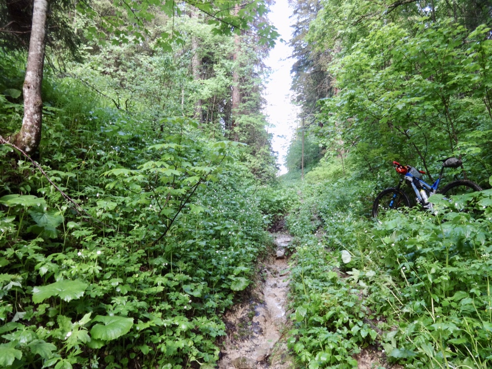 Zum Glück erreichte ich bald eine Strasse, welche jedoch immer schmaler wurde, bis nur noch ein sumpfiger Pfad übrigblieb. Und dieser führte auch noch steil den Berg hoch!