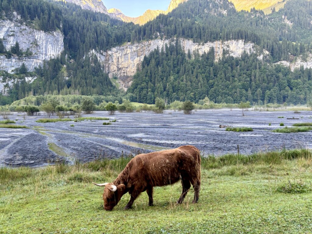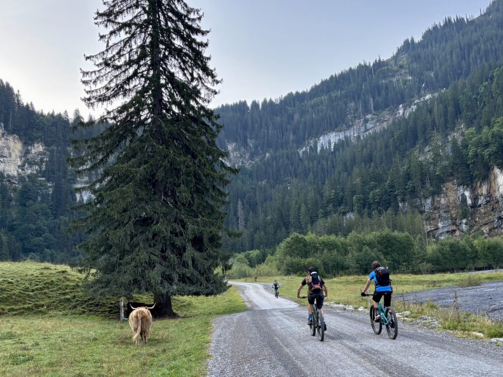 Bereits nach den ersten Metern führte uns die Routenwahl stetig bergauf, erst noch wenig zornig, immer der Teerstrasse folgend, ins schöne Kiental hinein. Der zweite Pumphalt fand dann, unter strenger Beobachtung zahlreicher Rindviecher, bereits fast beim ehemaligen Tschingelsee statt. Der Reifen schien dabei eine Art von Selbstheilungsfunktion zu besitzen, oder war ab so viel Zorn derart beeindruckt, dass er seine Luft fortan bei sich behielt.