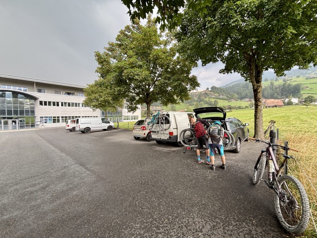 Der Rückweg von Kandersteg nach Reichenbach wurde von einer ausgiebigen Einkehr im Frutigresort unterbrochen. Als wir schlussendlich weiterfuhren, türmten sich fern über der Fritschi Swiss AG bereits pechschwarze Wolken und kündigten den Zorn des Petrus an. Mit den ersten scheuen Regentropfen erreichten wir wieder unsere parkierten Fahrzeuge. Blitzschnell waren die Bikes und Rucksäcke verladen und alles zur Abfahrt bereit.